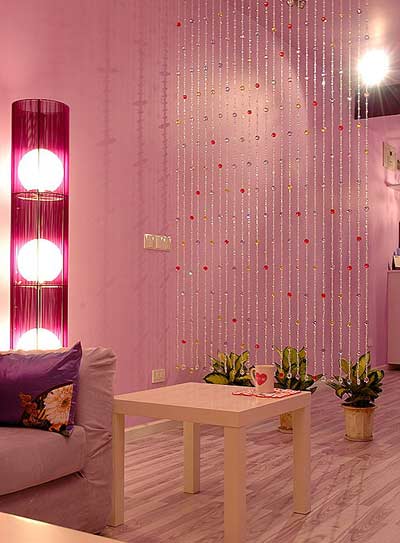 作為隔斷,珠簾的色彩與款式要與居室風格色彩協(xié)調(diào)。例如,溫馨浪漫風格適合粉色、紫色,款式可以使用水晶珠簾;清爽簡約風格適合環(huán)串式的水晶珠簾,以藍白色為宜;時尚感強的居室則適合用紅色、綠色等色彩鮮艷的珠簾搭配;但歐美古典風格當然還是使用透明的水晶最顯高貴了。