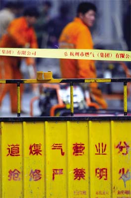 一處地下管道煤氣泄漏,發(fā)生爆炸,搶修工作正緊張忙碌地進(jìn)行中