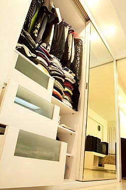 更衣室比作衣櫥便宜,設(shè)計(jì)師便從兒童房偷出將近1坪(1坪等于3.3平方米)的空間,用木作夾板隔出更衣室,為了美感,設(shè)計(jì)師還特別在壁板挖了洞作造型。