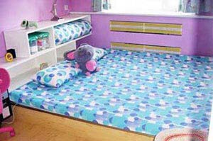由于屋主有2個(gè)女兒,臥房最少也要1張雙人床或2張單人床。設(shè)計(jì)師考量既然要作木地板,不如把地板架高,在地板上擺2張單人床墊,就可以省下2張單人床架的費(fèi)用。架高地板雖然得再加錢(qián),但比起2張床架的錢(qián)還是便宜的。