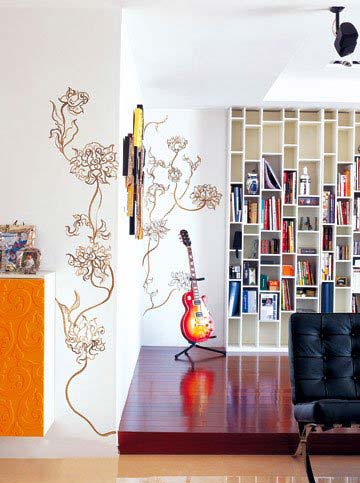 簡約風(fēng)格的家中,往往蘊(yùn)涵著一語道破的 驚喜,如同一個(gè)不顯山露水的人,卻可能擁有耐人尋味的人格魅力。二者另一個(gè)共同點(diǎn)在于,都需 要我們?nèi)グl(fā)現(xiàn)和探尋。進(jìn)門正對著的墻壁,是給來者第一眼的印象,起初不敢畫,因?yàn)檫@個(gè)位置太 重要,太顯眼。丙烯、金漆,出來后的效果令人滿意,于是它們繼續(xù)'攀爬' 到客廳的墻面上。