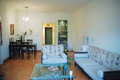 舊貌客廳有中式古典風(fēng)格,胡桃木色沙發(fā)座架、餐桌、茶幾,地面是土黃色地磚,墻面以白色為主,除了沙發(fā)座套上一些中式書法圖案,整個房間顯得深沉老氣。