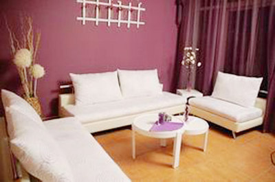新顏踏進客廳后的第一感覺是清秀、浪漫,宛如一個僅施淡淡粉黛的女孩。紫色是整個空間的主角,深深淺淺的紫彌漫在各個角落,紫色的浪漫在整個空間里蕩漾。墻體、窗紗是較深的紫,裝飾桌布、餐桌椅套是輕柔的紫色來統(tǒng)一;電視墻三塊深紫、桃紅、粉紅的畫板與整體色調(diào)一致。