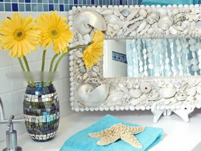 奇異的花瓶,也許成了這里一道迷人的風(fēng)景線,閃爍著海洋的光芒,嬌艷的花朵,點亮了空間。用貝殼鑲邊的鏡子,更是裝飾的恰到好處,大膽而又美麗,反射出更大的浴室空間。
