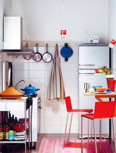 如果你平時(shí)很少下廚,不如把采光良好的明廚劃入起居空間,而把廚房隔壁的狹小空間布置成廚房。根據(jù)房間大小,選擇尺寸適合的冰箱、灶具、餐臺(tái),建議選擇白色和不銹鋼顏色的廚房產(chǎn)品,用鮮亮色彩的餐廚用具做適當(dāng)點(diǎn)綴,獲得玲瓏精致的效果。