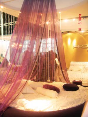 浪漫,只有跟最愛(ài)的人在一起,才能體會(huì),才是現(xiàn)實(shí)。張麗星家具展廳里最打眼的,當(dāng)屬這款兩米見(jiàn)方的安吉思情人大圓床:大紅色的床身、高垂而下的紫色幔帳,隨手可觸的黃色海綿抱枕,看到這充滿浪漫情調(diào)的盛滿愛(ài)的溫床,你多想像《浪漫櫻花》里一樣,和自己心愛(ài)的人一起,體味這種相濡以沫的浪漫。