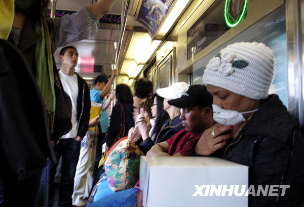 4月29日,在美國紐約,一名戴著口罩的乘客乘坐地鐵。當日,美國疾病控制和預防中心代理主任理查德·貝塞爾表示,美國境內確診的豬流感患者人數(shù)已經上升至91人,其中包括一名現(xiàn)已死亡的墨西哥兒童。 新華社記者劉欣攝
