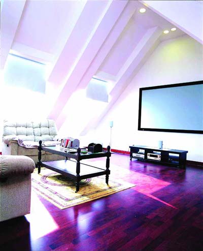 如今,在客廳里為自己準備一套“家庭影院”已經(jīng)并不稀奇了。利用閣樓空間,為自己和家人打造一個“高高在上”的“私人電影院”才叫時尚。一面墻的寬大屏幕,幾把舒適柔軟的沙發(fā),一滿桌的零食冷飲。當窗簾放下,燈光熄滅,一家人滿懷期待地注視著銀幕,此時的觀賞感受是任何高檔電影院都提供不了的。為了增加些家庭的樂趣,你還可以在電影“放映”前自己動手畫一幅“宣傳海報”貼在餐廳的墻上,或是畫幾張“電影票”送給家人們。