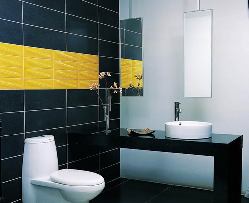 視覺的享受更多的來自于色彩和線條的和諧搭配,瓷磚是衛(wèi)浴空間中色彩和線條舞動(dòng)的最大載體。在暗色瓷磚中橫向加入一條明黃色花磚,小空間的沉悶感立刻一掃而光?;ùu表面凸起的斜紋,不僅打破衡平豎直的線性關(guān)系,還使得墻面充滿張力。色彩的對比與線條的對比,是使小衛(wèi)浴看起來時(shí)尚而有設(shè)計(jì)感的關(guān)鍵。