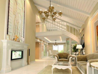 從花園進(jìn)入客廳,田園風(fēng)格繼續(xù)延伸,設(shè)計(jì)師大面積地運(yùn)用白色與米色。白色水曲柳拼板的斜頂天花,素白的天然石壁爐,精致的原木雕花扶手,細(xì)膩的石線條,大面積的米黃色墻紙,象牙般的地磚,再結(jié)合白色、米色家具,整個格調(diào)溫馨浪漫,既有西歐廳堂的大氣,又充滿著田園的風(fēng)味,氣質(zhì)高貴,格調(diào)高雅。