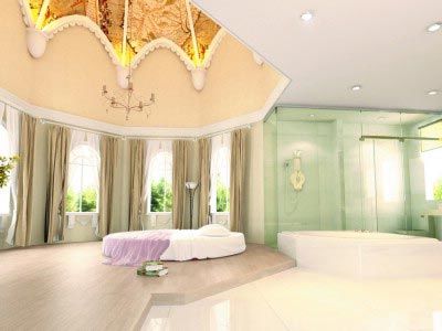 主臥室的設(shè)計(jì)很有特點(diǎn)。設(shè)計(jì)師利用原有建筑的八角尖頂采用了哥特式的建筑風(fēng)格而設(shè)計(jì)了天花頂。睡在圓形床上往上看,天花頂上的古典油畫讓人充滿遐想。半開放的浴室更是讓人沉醉,躺在圓形浴缸里品味著紅酒的芬芳,聽著優(yōu)雅的音樂,讓人忘記了所有的煩惱和工作的壓力。