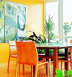 餐廳墻面的色彩設計因個人愛好與性格不同而存在較大差異??偟膩碇v,應以明朗輕快的色調(diào)為主,經(jīng)常采用的是橙色以及相同色相的“姊妹”色。這兩種色彩都有刺激食欲的功效,它們不僅能給人以溫馨感,而且能提高進餐者的情緒,促進人們之間的情感交流。當然,在不同的時間、季節(jié)及心理狀態(tài)下,人們對色彩的感受會有所變化,這時可利用燈光的折射效果來調(diào)節(jié)室內(nèi)的色彩氣氛。