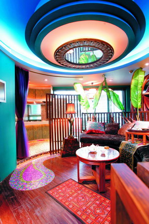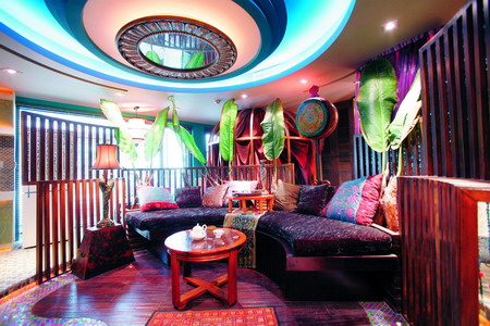房間的主題為“孔雀”,屋主傾力制造一個(gè)純粹女人的、私密的、妖嬈的空間。女性的柔美與韌性都釋放在屋內(nèi)或長或短的曲線、或大或小的圓里。一進(jìn)大門,展現(xiàn)在眼前的是一個(gè)欄木圍合的圓形客廳,弧線形的坐榻代替了傳統(tǒng)的沙發(fā),想象中美人們靠在香軟的榻上,低低地說點(diǎn)閨中密語該是很愜意的吧。沿著圓形客廳是兩條曲線的小路,一條從門邊經(jīng)過洗浴區(qū)到達(dá)床前,一條從餐飲區(qū)去向陽(向陽博客,向陽新聞,向陽說吧)臺(tái)。廚房也是弧線形的。又有誰知道,這間房原本是四四方方的呢?