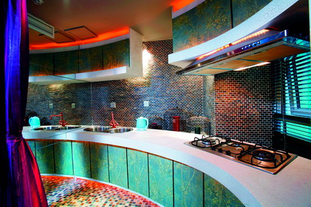 寶石藍(lán)、玫瑰紅、暖橘色、暗綠,空間的色調(diào)非常濃烈,激烈碰撞的效果讓人第一時(shí)間感受到這里是女人的世界。從玄關(guān)走下一步,踏進(jìn)圓形客廳,立刻感到幽暗神秘的氛圍。抬頭看看,原本不高的房屋又加了圓形的三層吊頂,鏡中映射出女人們聚會(huì)的情形,暗藍(lán)色的燈圈更增添了一分憂郁。廚房區(qū)域和玄關(guān)區(qū)域都用了薄荷一般的綠色,給幽暗的空間帶來一點(diǎn)清新。而從兩條小路分別走進(jìn),看到的則是猩紅色金絲絨鋪就的圓形大床,玫瑰色的浴室吊簾也強(qiáng)調(diào)了這里的奢靡氛圍。