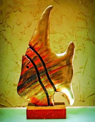 金色大海魚一端魚鰭插入底座,上揚的魚鰭、波浪形的線條,充滿了海底動感。