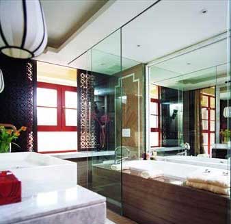 厚重的石材與輕盈的玻璃讓衛(wèi)浴間充實(shí)而簡(jiǎn)潔,沒有過多的裝飾,而用中式的雕花窗扇來營(yíng)造濃郁的浪漫風(fēng)情。透過雕花斑駁的光影,原本直白的光線變得富有情調(diào),簡(jiǎn)練與柔媚,兩種不同的風(fēng)情因?yàn)殛柟獾娜谌?,巧妙地結(jié)合在一起。而木質(zhì)窗扇既不怕水又能透光,是布藝窗簾所不能比及的。