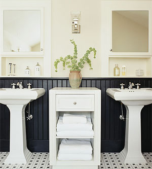 水盆上方的一對(duì)墻面柜可以用來(lái)存放牙膏、漱口水、阿司匹林等用品。經(jīng)常會(huì)使用的用品,如 肥皂、洗發(fā)沐浴用品、香水、化妝品等就存放在墻柜下方的置物格里。兩個(gè)水盆之間的櫥柜就用來(lái)存放毛巾和浴衣等。