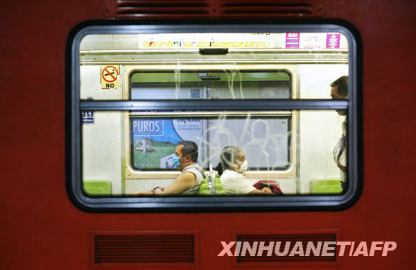 5月2日,在墨西哥首都墨西哥城,兩名乘客戴著口罩乘坐地鐵。新華社/法新