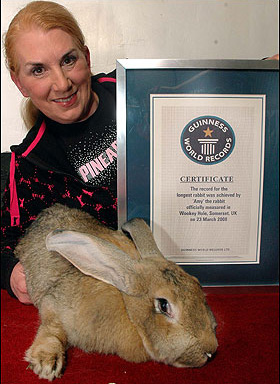 這只名叫艾米的巨型兔長1.2米,體重20公斤,每天要吃掉兩個(gè)蘋果、半個(gè)卷心菜、一把胡蘿卜,以及大量新鮮青草和混合飼料,2008年它被吉尼斯世界紀(jì)錄評(píng)為全球體積最大的兔子。據(jù)艾米的主人、現(xiàn)年56歲的英國婦女安妮特·愛德華茲介紹,她前不久帶著艾米從英國飛往意大利參加一檔紀(jì)錄片節(jié)目的拍攝。但在拍攝完成當(dāng)晚,艾米就在旅館里告別了人世。
