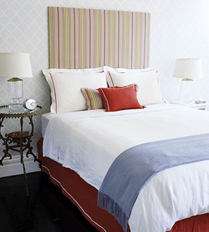 用亮麗耀眼的色彩粉刷一面墻壁,是打造家居看點最快、最有效的方法。紫紅色甜美而溫馨,但如果刷滿四面墻,就顯得太過瘋狂和病態(tài)了。在這個案例中,一面墻適當(dāng)?shù)厥褂昧俗狭_蘭色,與黃色床頭板形成對比,突出了床這一“主角”。