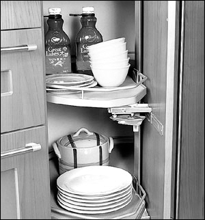 櫥柜五金配件中,除了滑軌、與之密切相關(guān)的抽屜、鉸鏈之外,還有許多氣壓及液壓裝置類的五金件。這些配件是適應(yīng)不斷發(fā)展變化的櫥柜設(shè)計(jì)方式而產(chǎn)生的,主要用于翻板式上開門和垂直升降門。有的裝置有三點(diǎn),甚至更多點(diǎn)的制動(dòng)位置,也稱為“隨意?!薄0惭b了壓力裝置的櫥柜,省力安靜,很適合老人家使用。