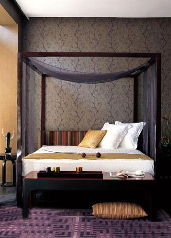 臥室中色調(diào)柔和的布藝床頭莊重典雅而不乏輕松浪漫的感覺,與灰紫色暗花紋壁紙和深紫色的格紋地毯相互呼應(yīng),多層次的色彩變化,中和了深色家具帶來的冷靜,帶有灰度的柔和色調(diào)讓整個房間停留在雅致迷人的氛圍里。線條簡潔的立柱床,富于個性又簡潔大氣,讓臥室有寬敞的空間感,床尾幾有光亮的色澤極富質(zhì)感,透露著低調(diào)的華麗,空間線條也得到充分延伸,視覺上呈現(xiàn)出理性與感性完美結(jié)合,既優(yōu)雅輕松, 又井然有序。