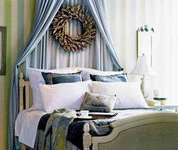 淺色的條紋墻紙、垂幔的床飾帶出浪漫的風(fēng)格, 藍(lán)色的床頭柜、白色的陶瓷臺燈,清爽的色調(diào)搭配在一起,讓臥室風(fēng)格鮮明。
