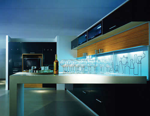 冷峻的黑色櫥柜,工業(yè)設(shè)計(jì)感極強(qiáng)的白色吧臺(tái),現(xiàn)代化的視聽(tīng)組合,暗藏彩燈的壁柜,甚至還有大做文章的墻壁,以不銹鋼擱板為界,上面是原始?xì)庀⒌哪?,下面是線條簡(jiǎn)潔的圖。如此分明的方式,組合著這些傳統(tǒng)和非傳統(tǒng)的事物,廚房陡然間變成各種新奇事物的展示臺(tái)。
