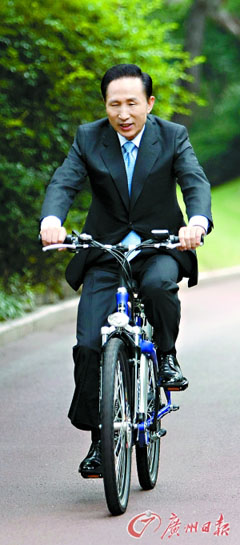 9月22日為“世界無車日”,李明博騎自行車從官邸前往辦公室。