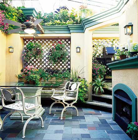 即使在沉悶的天氣里,下沉花園上方懸臂上的吊扇,也會(huì)給在花園里乘涼的人帶來(lái)習(xí)習(xí)清風(fēng)。到了寒冷的季節(jié),就是漂亮壁爐發(fā)揮作用的時(shí)候了,暖暖的火光能驅(qū)走寒冷,增加戶外空間的使用時(shí)間。花園中種滿熱帶氣息的植物,如棕櫚樹、芙蓉花、黑葉芋與一年生植物、蔓生植物填滿了花箱和花盆,給小庭院帶來(lái)生機(jī)勃勃的感覺(jué),也達(dá)到了阻隔外界視線、保護(hù)隱私的作用。而小噴泉潺潺的流水聲則把街道的喧囂淹沒(méi)在外。