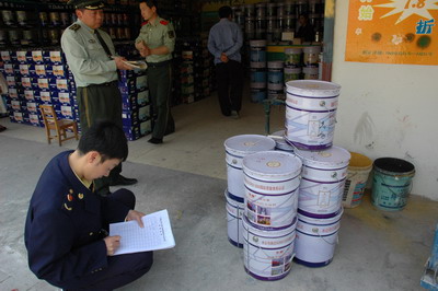 倉庫門口堆著幾十袋涂料,執(zhí)法人員走近一看,上面寫著“運(yùn)城小康涂料”,廠址卻標(biāo)明“運(yùn)城市鹽湖區(qū)南環(huán)路”。詢問中年婦女得知,該廠原本設(shè)在市里,去年年底搬至此地,始終“沒有辦過執(zhí)照?!眻?zhí)法人員查看這些涂料時(shí),發(fā)現(xiàn)壓在下面的涂料袋子上寫著“太原豐翔涂料”,因懷疑是假冒涂料 ,執(zhí)法人員立即對該廠展開搜查。