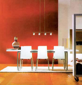餐廳里若選用吊燈作主光源,那么就要根據(jù)房間的層高、餐桌的高度、餐廳的大小來(lái)確定吊燈的懸掛高度。大多數(shù)吊燈的懸垂鐵絲是固定的,只能在安裝前調(diào)節(jié)好長(zhǎng)短,一般吊燈應(yīng)與餐桌相距約55——60厘米。您若想適時(shí)地調(diào)整吊燈高度,還可以選擇具有隨意升降裝置的燈具。需要注意的是,吊燈的懸掛高度直接影響著光的照射范圍,過(guò)高顯得空間單調(diào),過(guò)低又會(huì)造成壓迫感,因此,只需保證吊燈在用膳者的視平線上即可。另外,為避免飯菜在燈光的投射下產(chǎn)生陰影,吊燈應(yīng)安裝在餐桌的正上方。