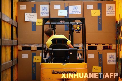 世界衛(wèi)生組織提供的照片顯示,5月5日,工作人員在瑞士羅氏公司在凱澤勞斯特的配送中心搬運藥品。羅氏公司12日宣布向世衛(wèi)組織捐贈總共565萬個療程的抗病毒藥“達菲”,以幫助應(yīng)對當前的甲型H1N1流感疫情以及可能由此引發(fā)的流感大流行。 新華社/法新