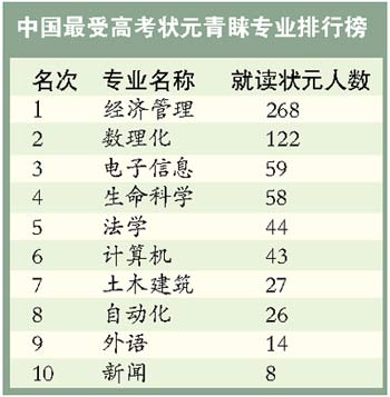 而1999年以來的高考狀元明顯集中于熱門專業(yè),如經(jīng)濟(jì)管理、生命科學(xué)、電子信息、法學(xué)和計(jì)算機(jī)等專業(yè)。2008年,全國(guó)有近七成高考狀元選擇就讀經(jīng)濟(jì)管理專業(yè)。