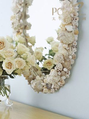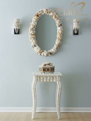 2 、不同的物件要選擇合適的貝殼來搭配。雞尾酒桌和壁式燭臺(tái)僅僅用了一、兩種貝殼;鏡子與盒子上卻聚集了各種形狀和大小的貝殼,看似隨意,實(shí)際上都是經(jīng)過細(xì)心安排的。