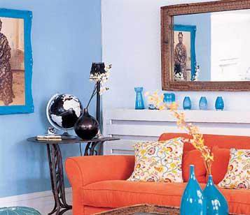 將橙色與綠松石色進行大膽的搭配,可以呈現(xiàn)出一種令人震撼的視覺效果。橙色的大沙發(fā)強調了整個空間的主體色調,沙發(fā)上圖案簡單的花卉靠墊與橙色主調形成一種呼應。泛白的綠松石色裝飾墻,延伸出另一種風格的空間。薄紗窗簾使室內的光線更加自然柔和,帶有戶外咖啡座風格的藤條茶幾和扶手椅,讓人很自然地感覺到悠閑與愜意。碰上好的天氣,可以很方便地將他們搬到陽臺上。鐵藝小桌上穩(wěn)固的大號蠟燭臺和漂亮的古典式燈籠可以非常方便地為室內或室外提供照明。