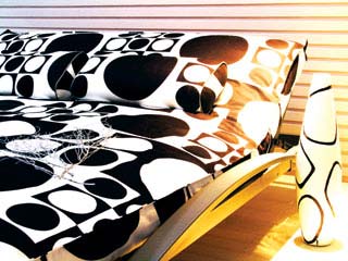 ★巧用墻面造型。圓系列樣板間客廳和臥室之間用簡(jiǎn)單的背景墻造型就區(qū)隔了空間,黑白相間的圓形和居室風(fēng)格協(xié)調(diào),造價(jià)也低,一張石膏板足夠用,裝飾效果也很好。