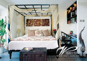 4、床架上輕薄的紗帳,為這個(gè)浪漫的小家搭建起一個(gè)甜蜜的巢