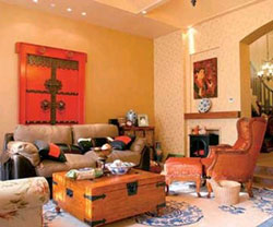 把風格迥異、材料不同的東西放在一起,能有成千上萬次的排列組合,考量著每個主人的審美和耐心。客廳的壁紙、地毯上底色,以及大件的沙發(fā)和茶桌都以暖黃的鄉(xiāng)村色為主,顯得親切溫馨,點綴上朱門裝飾的大紅,果盤及地毯花紋上的正藍作為跳色,一下就凸顯了房間的靈氣。雖然是多種元素共存,但不代表亂搭一氣。以色彩作為融合點,是最基礎(chǔ)的混搭方法。在考慮整體風格的時候就需要定下一兩個基本色,然后在這個基礎(chǔ)上添加同色系的家具,配飾則可以選擇柔和的對比色以提升亮度,也可以選擇中間色以顯示內(nèi)斂。