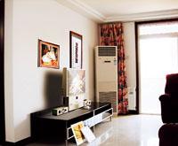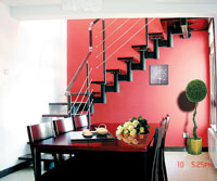 本案例的整體色調(diào)都把握在紅、黑、白之中,這樣的基調(diào)處理正好適合了業(yè)主的視覺選擇,同時(shí),又顯出脫俗的品位和視覺沖擊力??蛷d簡潔的造型頂給本身不算太寬闊的空間留下簡練的線、面結(jié)合體,從而使整個(gè)客廳的空間得以更多的延續(xù)。相比之下,餐區(qū)的異型頂就更顯得有些目的性了,它的出現(xiàn)完全是為配合樓梯口的一道斜梁而設(shè)計(jì),這樣從視覺上弱化了斜梁,并采用極具誘惑而又熱烈的紅色作為樓梯背景。