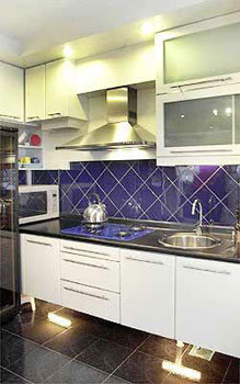 廚房布置摩登,尤其是藍(lán)色壁磚,在黑白配搭中顯得突出。