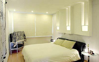 從房門進(jìn)入,就是睡床所在之處。這里的色調(diào)以乳白色為主,床頭墻壁的設(shè)計,融入柔和的燈光,配上兩旁宛如小蠟燭的床邊燈,使得整個房間的氣氛變得額外祥和。