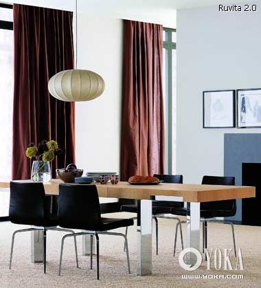 2.加長的餐桌適合面積較大的餐廳使用,顯得大氣。同時,在大空間中更要注意色彩和材質的呼應,否則容易顯得松散;原木色餐桌面跟咖啡色厚絨窗簾、淺褐色羊毛地毯顏色十分協(xié)調,餐桌腿所用的金屬材質跟餐椅腿也有所照應,整體性由這些細節(jié)而得到加強。