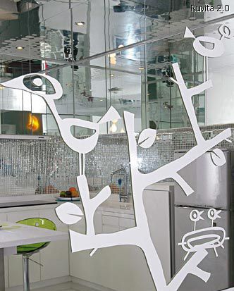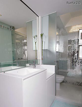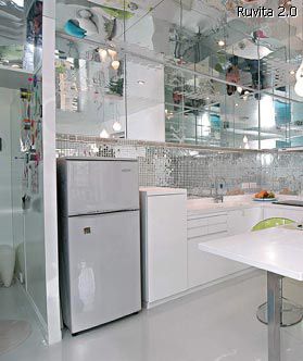開放式廚房加裝了閃亮的鏡面馬賽克和廚柜面板