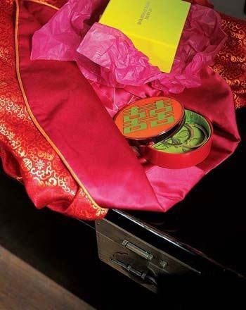 中國紅的綢緞床蓋,喜氣又奢華,奠定了整個臥室的婚慶基調(diào)。而床頭柜上的花鳥紋紙巾盒,美人斛中盛開的鮮花,墻上掛的刻有花形紋的木器,這一切與床蓋上的月圓雙喜圖,相映成趣了一片真正的花好月圓。