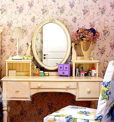 梳妝臺(tái)一般由梳妝鏡、梳妝臺(tái)面、梳妝品柜、梳妝椅及相應(yīng)的燈具組成。梳妝鏡一般很大,而且經(jīng)常呈現(xiàn)折面設(shè)計(jì),這樣可使梳妝者清楚地看到自己面部的各個(gè)角度。梳妝臺(tái)專用的照明燈具,最好裝在鏡子兩側(cè),這樣光線能均勻地照在人的面部。若將燈具裝在鏡子上方,則會(huì)在人眼框留下陰影,影響化妝效果。