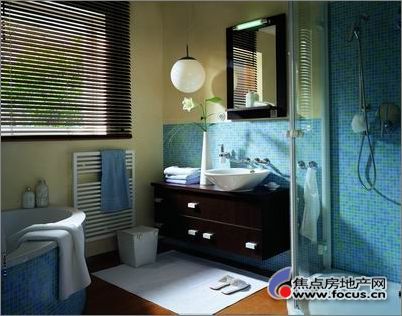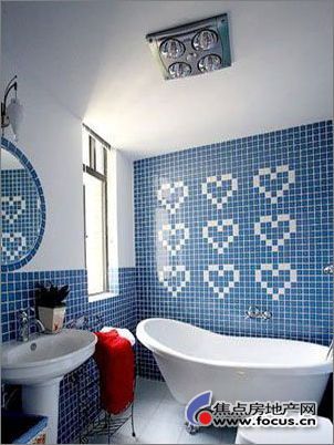 說到藍(lán)色會(huì)自然聯(lián)想到天空、海洋、寧靜、安詳。巧妙的運(yùn)用了馬賽克拼搭出特色的墻面,顯得不那么死板。如果有較多的雜物要放置,可以在墻角搭上建議的隔板。