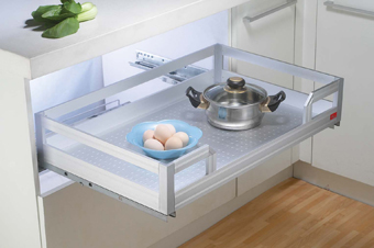 門板里面如果使用擱板,最內(nèi)側(cè)的東西往往需要哈腰才能夠到。這種四邊都延展無(wú)余的拉籃,可以輕松拿到里面的物件,設(shè)計(jì)更人性化。