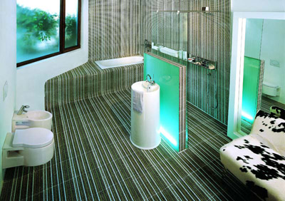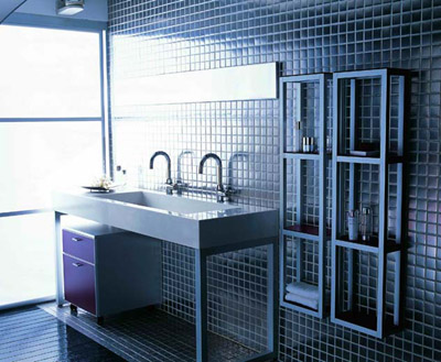置身在博洛尼冰冷的太空艙稱得上是沁人心脾的清涼。金屬馬賽克鋪貼墻面和鈦鋁合金浴室家具的超強(qiáng)組合將清涼發(fā)揮淋漓盡致,光線的變換指揮著墻面有節(jié)奏的不停跳動(dòng)。沖個(gè)溫水澡,冰冷中彌漫溫情和享受。