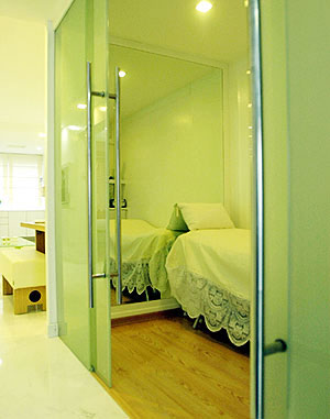 玻璃墻飾也是近來設(shè)計師喜歡用的裝飾手法,一來可以拉大房子的空間感,二來富于變化,常常給人驚喜。葉教授認為,玻璃墻飾可以接受,但是有一個原則是不宜對床。此外,玻璃墻飾必須得靠實墻而置,不會令空間虛實不明。葉教授最后說,總之,家居中的玻璃裝飾不宜過多,具體如何運用,不同的房間結(jié)構(gòu)則有不同的說法。